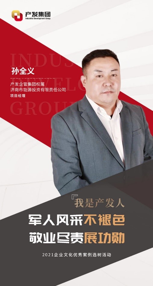 孫全義,現(xiàn)任產(chǎn)發(fā)企管集團(tuán)權(quán)屬濟(jì)南市能源投資有限責(zé)任公司(以下簡(jiǎn)稱“能投公司”)項(xiàng)目經(jīng)理。2001年參軍,在部隊(duì)期間刻苦訓(xùn)練,聽(tīng)黨指揮,服從命令。2003年他從部隊(duì)光榮退役,隨后加入能投公司。期間曾借調(diào)至濟(jì)南市發(fā)改委幫助工作,現(xiàn)負(fù)責(zé)能投公司的資產(chǎn)管理工作。